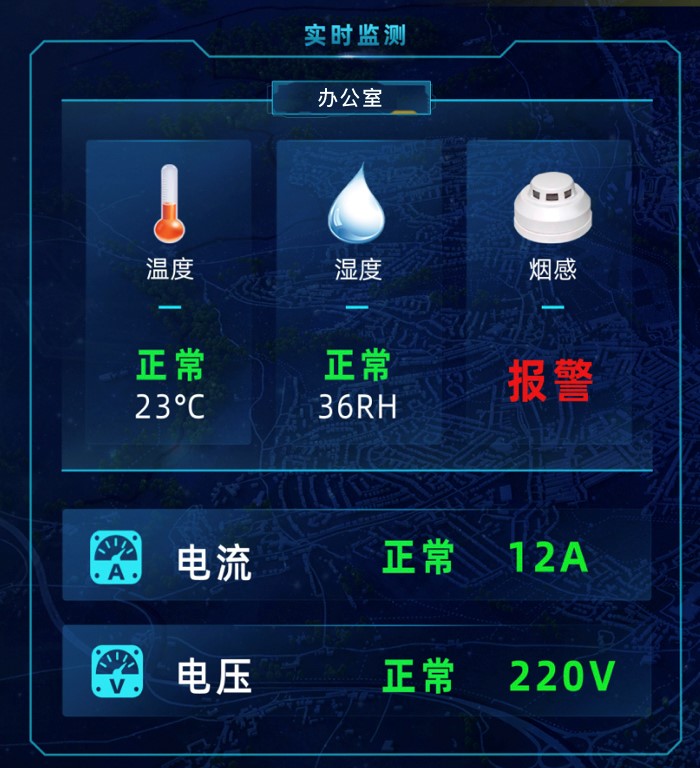可根據的實際平面布局圖,添加成電子地圖,將各智能傳感、攝像機等設備點位標注在電子地圖上。即顯示所有傳感器主題及位置,正常是為綠色,告警時為紅色。